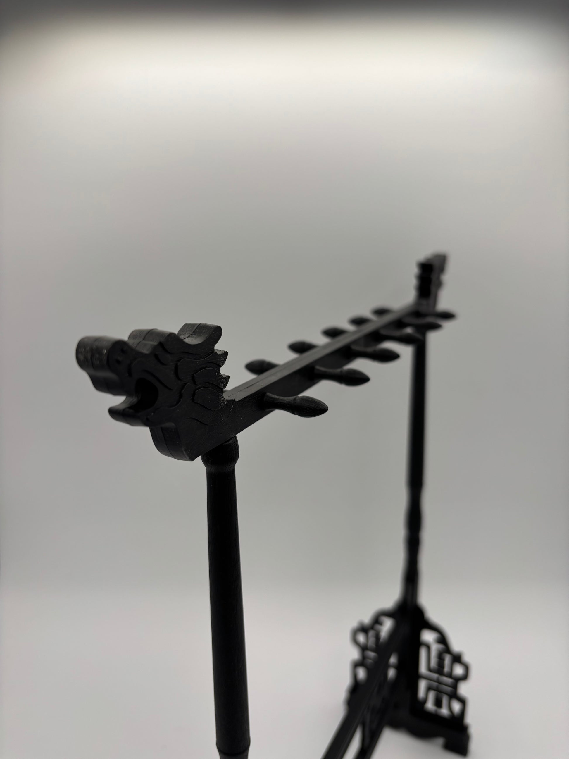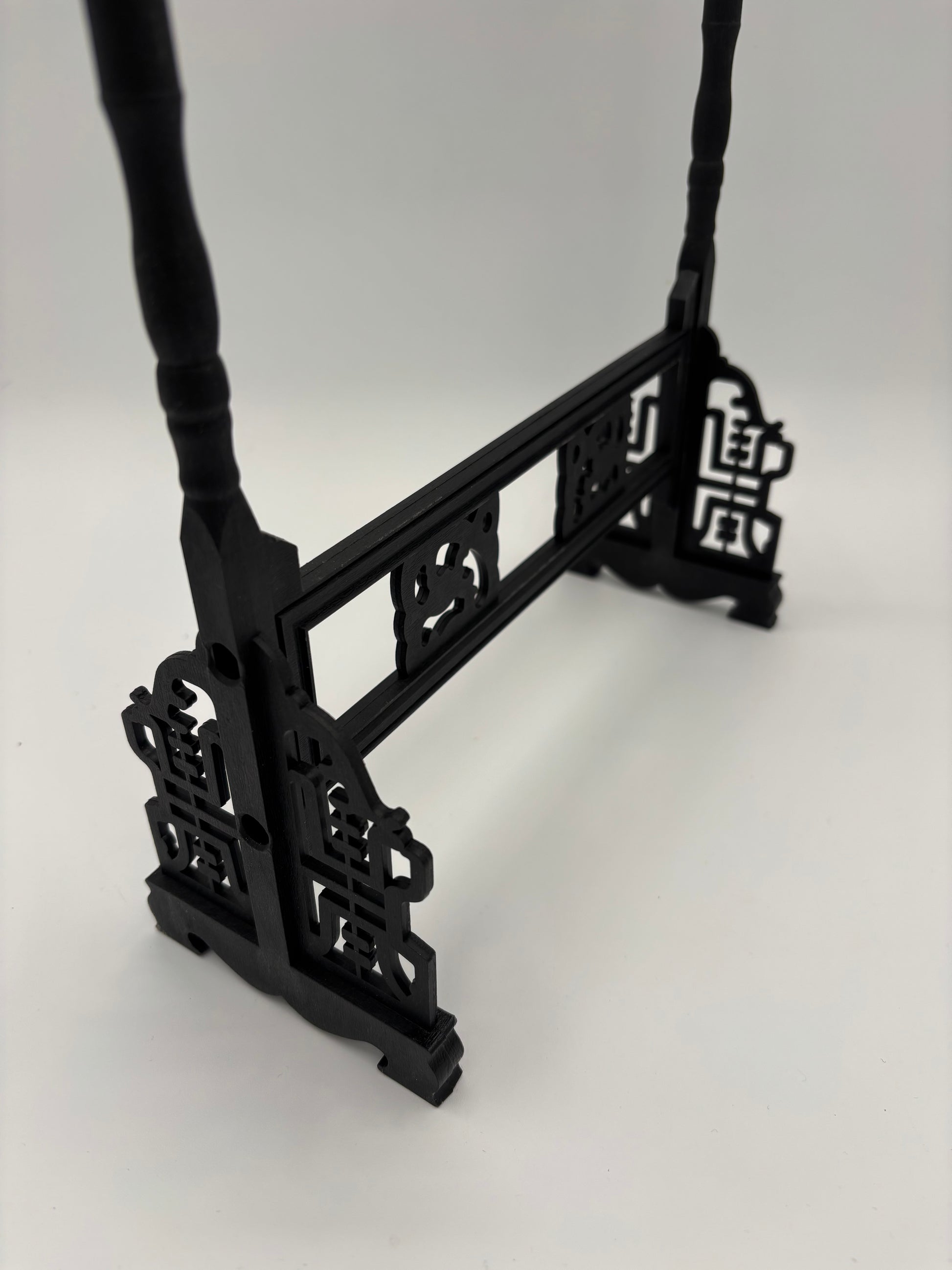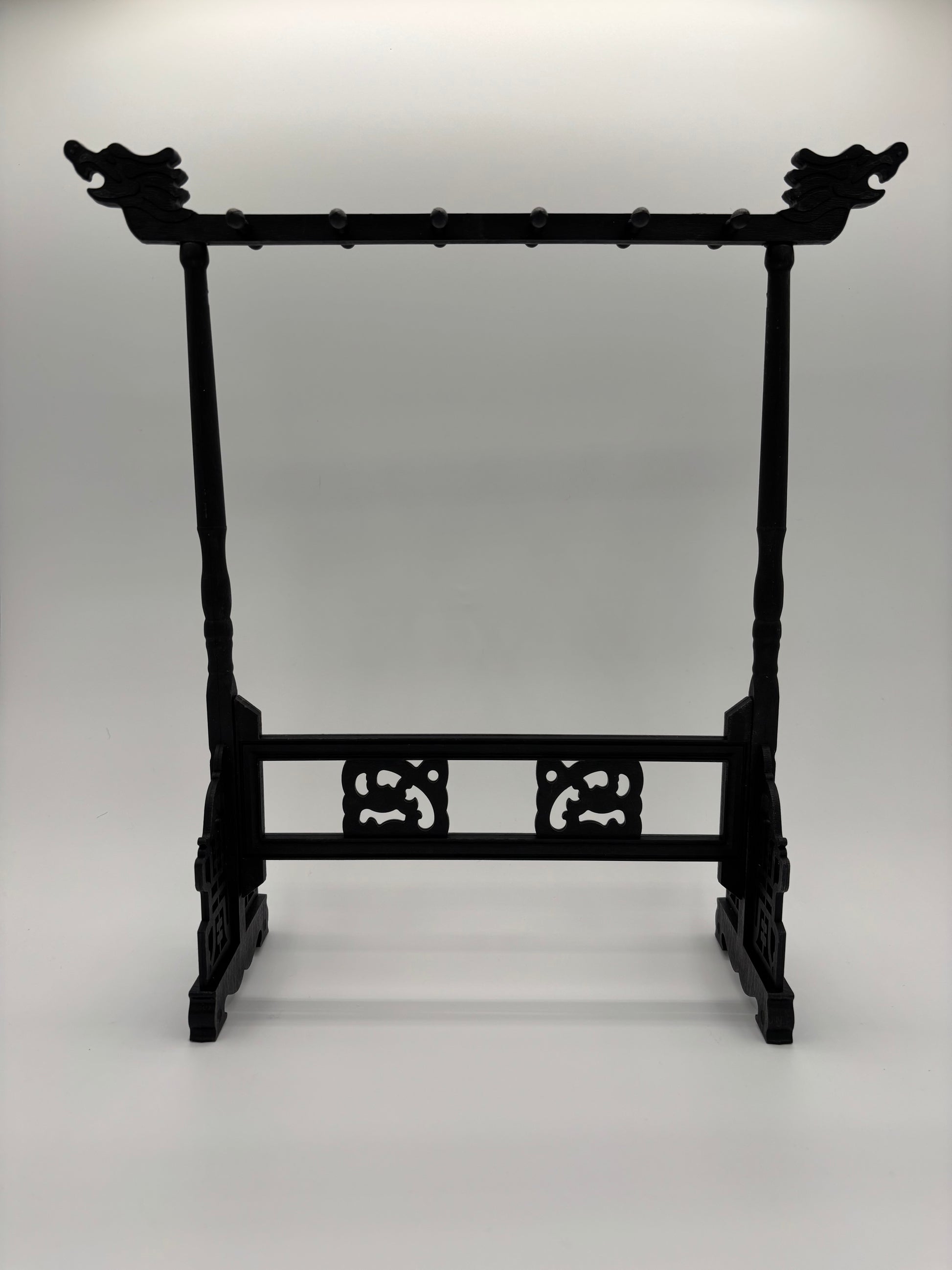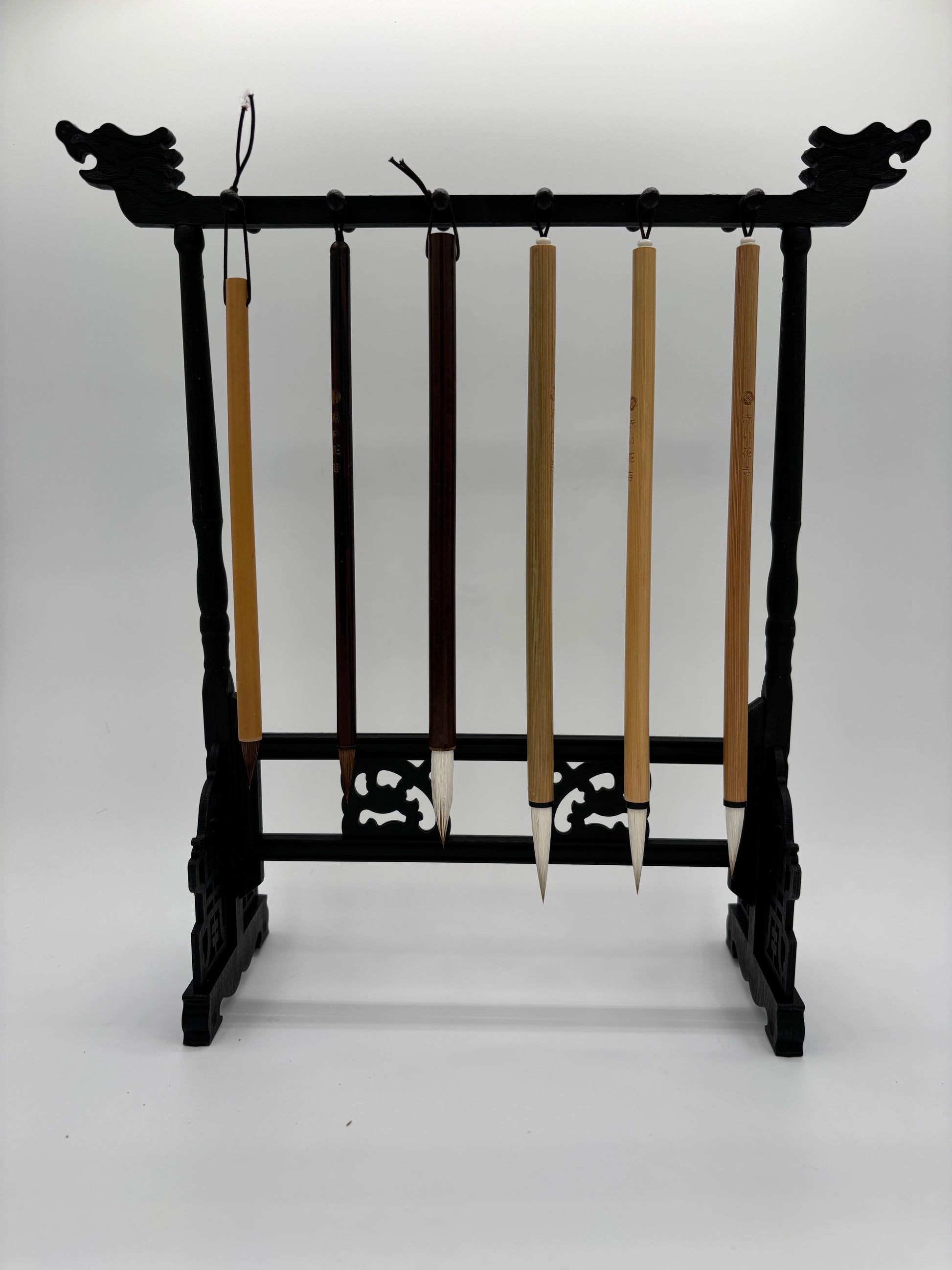 This plastic brush hanger is designed to hold and display multiple brushes. The stand features a traditional style with decorative dragon-shaped ends and carved-look details along the base. A horizontal bar across the top includes 12 hooks for hanging brushes to air dry and maintain their shape.
